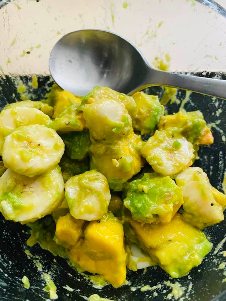 至於酪梨沙拉,通常我會用酪梨塊+對切小番茄+切碎香菜來製作。但這次因為我剛好在做巧克力香蕉蛋糕義賣,要賣的東西當然要給最好的食材,留下的香蕉頭尾不少,有點可惜,沒想到拌在酪梨裡超好吃!