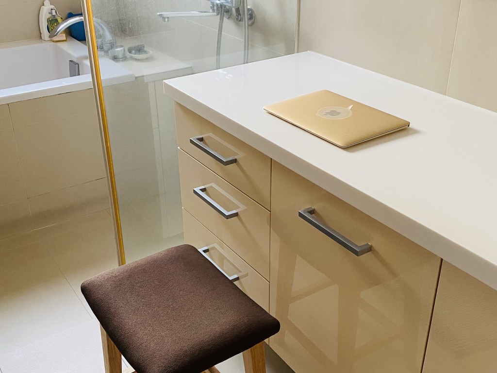 還好那裏有個寬敞的化妝台,乾乾淨淨的能擺下我的電腦和文具。你在左手邊,右手邊是個盥洗台,我坐在中間工作。唯一討厭是左後方有個馬桶。如果沒有那個馬桶、如果沒有那個大大的浴缸,這幾乎像間書房了。我知足到想其實我只需要一個這樣小小的地方。可以工作、同時照顧你,這就是最好的生活環境。